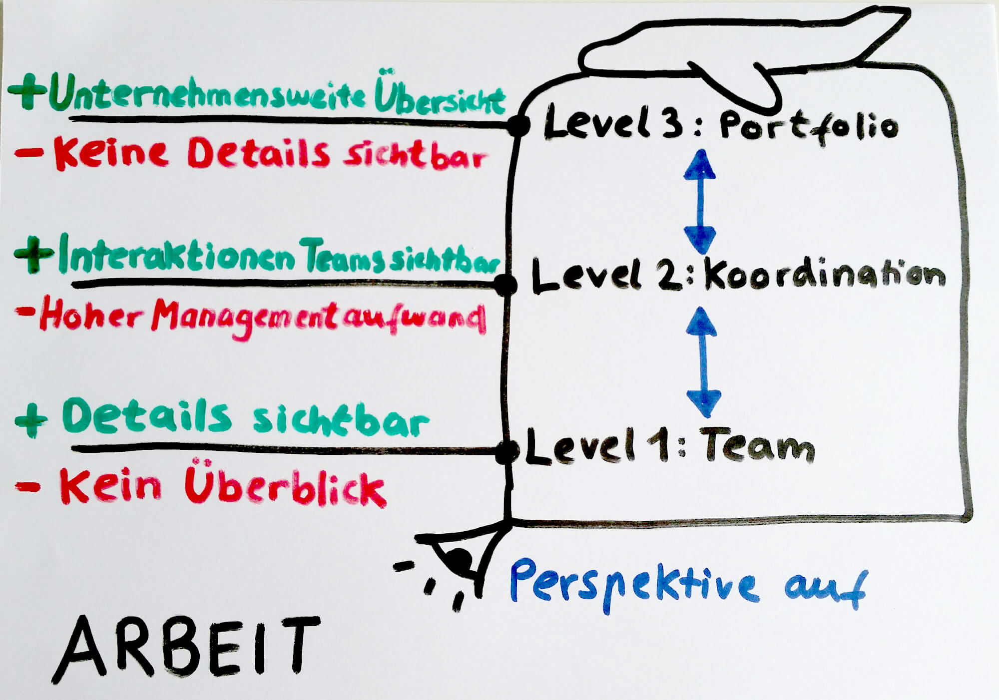 Wieso hilft Kanban aber bei der Aufstellung eines Projektportfoliomanagements? Der Schlüssel liegt darin, dass es, im Gegensatz zu Scrum, nicht (nur) auf die Teamarbeit ausgerichtet ist, sondern sich für die Portfolio-Ebene skalieren lässt. Prominentestes Beispiel für ein skaliertes Kanban-Modell ist das von Klaus Leopold und Siegfried Kaltenecker entwickelte Flight Levels-Modell. Diese „Flight Levels“ meinen im übertragenen Sinne die Höhe der Vogelperspektive, die ich als Betrachter auf die Arbeit eines Unternehmens werfe. Fliege ich hoch, habe ich Überblick, sehe aber keine Details. Fliege ich tief sehe ich die Details, habe aber keinen Überblick. Wir brauchten eine hohe Flughöhe.