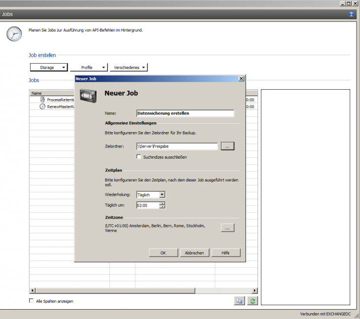 MailStore Server beinhaltet eine integrierte Backup-Funktion, welche in einfachen Schritten durch den Admin eingerichtet werden kann. Über einen sogenannten Job kann dieser bestimmen, wann und in welchem Intervall das Backup beziehungsweise die Datensicherung durchgeführt werden soll. Dieser hinterlegte Job legt nach erfolgreicher Durchführung des Backups zusätzlich zwei Restore-Dateien an, welche die Wiederherstellung ganz leicht durch nur einen Doppelklick anstoßen.