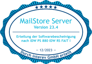 Wie üblich haben wir auch die neue Version 23.4 von MailStore Server und der MailStore SPE von einem unabhängigen IT-Revisor und Datenschutzexperten zertifizieren lassen.
