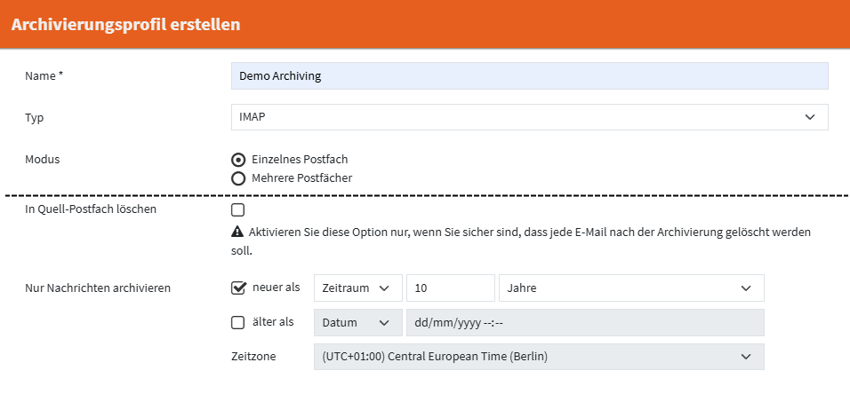 Archivierungsprofile können dazu genutzt werden um E-Mails aus öffentlichen Clouddiensten wie Microsoft 365 oder Google Workspace, oder von E-Mail-Servern wie Microsoft Exchange oder anderen Servern die E-Mails via IMAP oder POP3 bereitstellen, zu archivieren. Die eigentliche Archivierungsaufgabe wird durch einen Zeitplan ausgeführt.