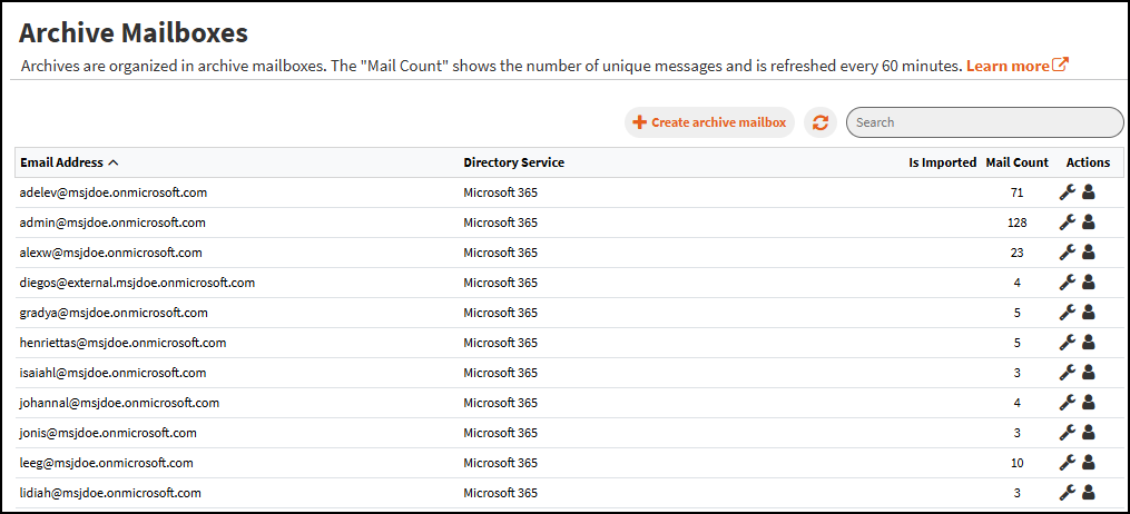 The Archive Mailboxes page has various features that can be used to create and manage mailboxes. The list view displays mailboxes via email in ascending or descending order. It also displays the Directory service, Imported status and the mail count.