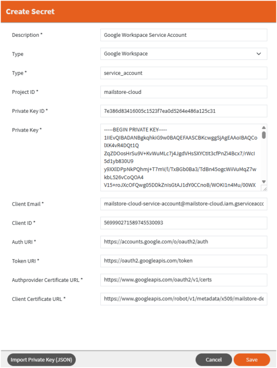- Click on Import Private Key (JSON) to automatically populate fields from JSON file.