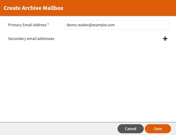- Click “Create archive mailbox”. You have to provide one primary mail address and optionally more secondary mail addresses. An archive mailbox will be represented by its primary mail address in the user interface throughout MailStore Cloud. Assuming you want to archive mails for the address “[email protected]” you would choose that as primary mail address. If there are aliases to that address, like [email protected], those could be used as secondary mail addresses.