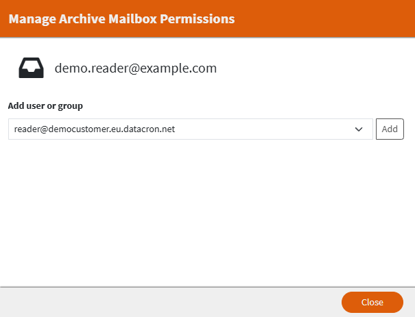 - You can either grant groups or single users access to archive mailboxes. For now, choose the Reader user and click “Add”.
